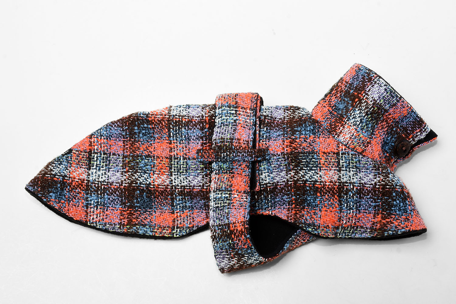 ラメ糸がきらめく、ファンシーヤーンのチェック生地を使用したIGコートです。オレンジ、ブルー、ブラウン、パープル、グリーン、ホワイト、シルバー。多彩な色を織り込んだチェック柄は、華やかでありながら上品な印象。見た目に反してとても軽く、春先のお出かけにも快適な着心地。裏地には暖かなフリース素材を使用しており、肌寒い日もしっかりと保温してくれます。軽やかさとあたたかさ、そして遊び心のある輝きを兼ね備えた一着。季節の変わり目に、コーディネートの主役として活躍します。