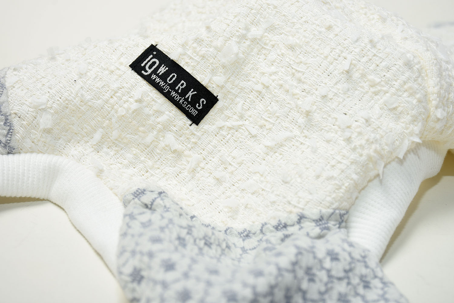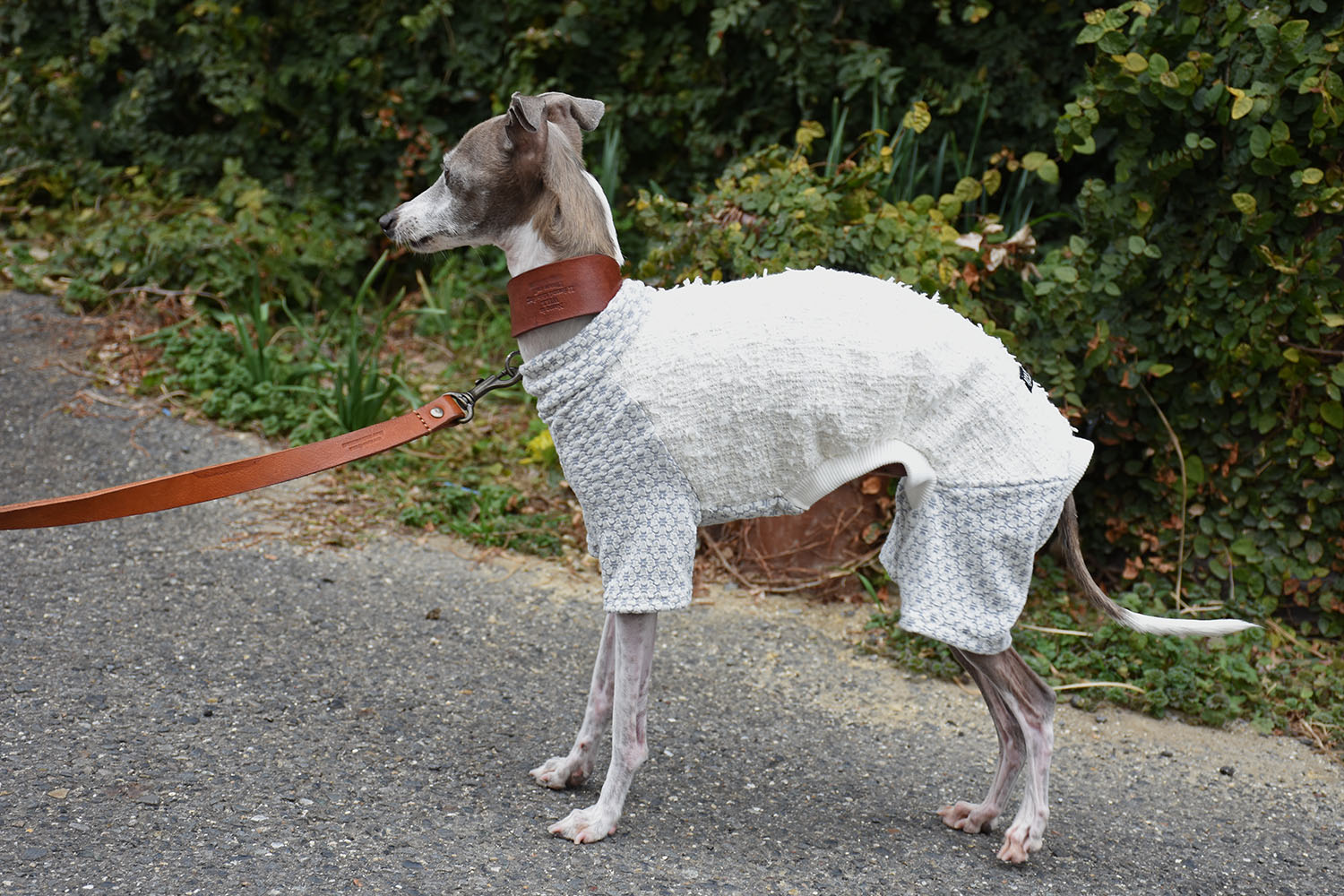 背中には尾州産の高品質なファンシーツイード、脚・胸・首には可愛らしいフラワーシャーリングニットを採用した、イタグレ専用のオールインワン。上品さと愛らしさを兼ね備えたデザインに仕上げました。快適な着心地と動きやすさにもこだわり、イタグレの魅力をより一層引き立てます。