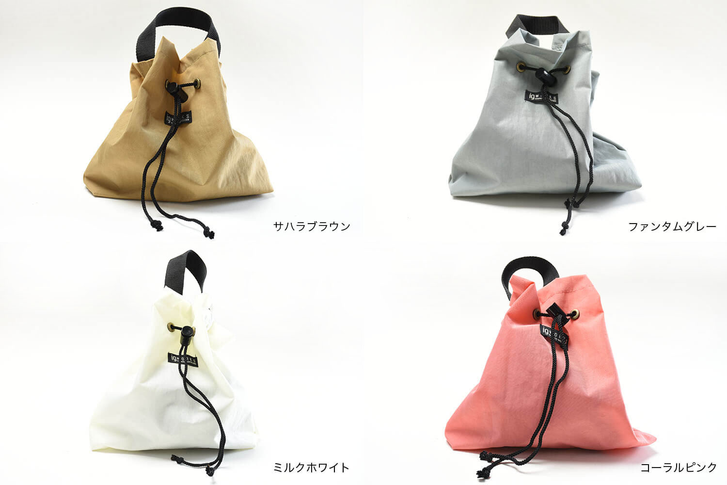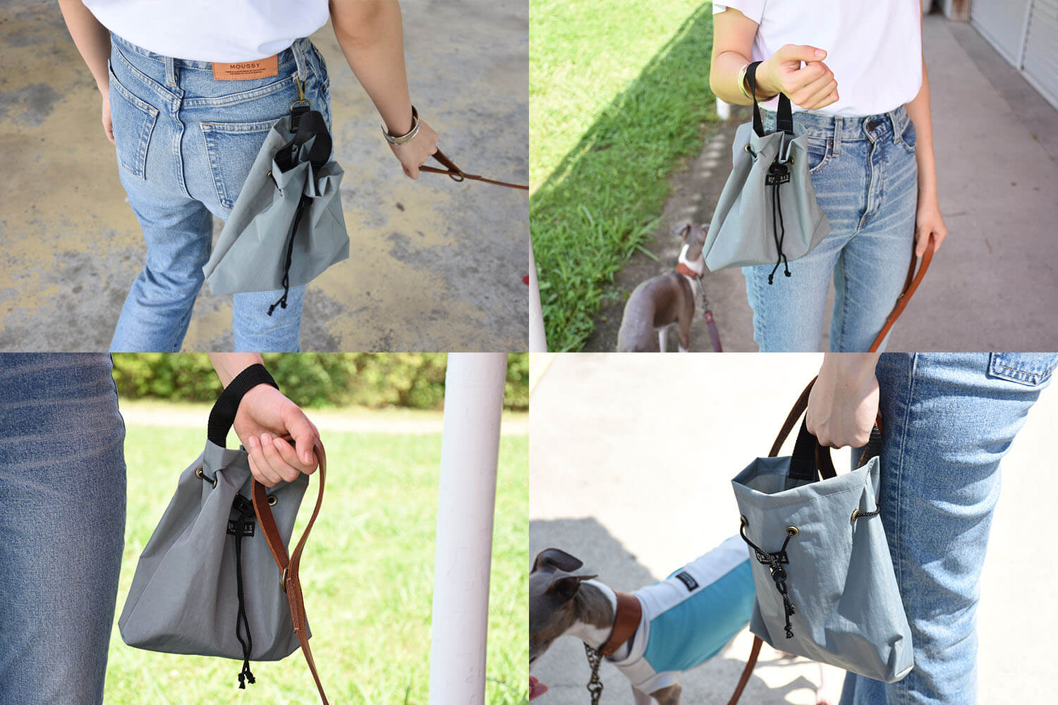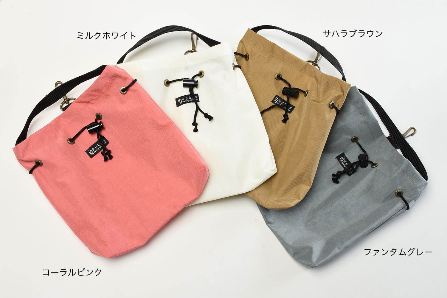 巾着型のとてもお洒落で使い勝手の良いお散歩バッグ。腰に引っ掛けるのはもちろん、短めの持ち手を手首にかければ両手を塞ぐことなく快適にお散歩することができます。生地は耐久性の高い厚めのナイロン生地で、弱撥水加工も施されているため、少々の水濡れや急な雨にも対応可能。毎日使うお散歩バッグに相応しいクオリティを実現しています。カラーはサハラブラウン、ミルクホワイト、ファンタムグレー、コーラルピンクの4色のラインナップからお選びいただけます。