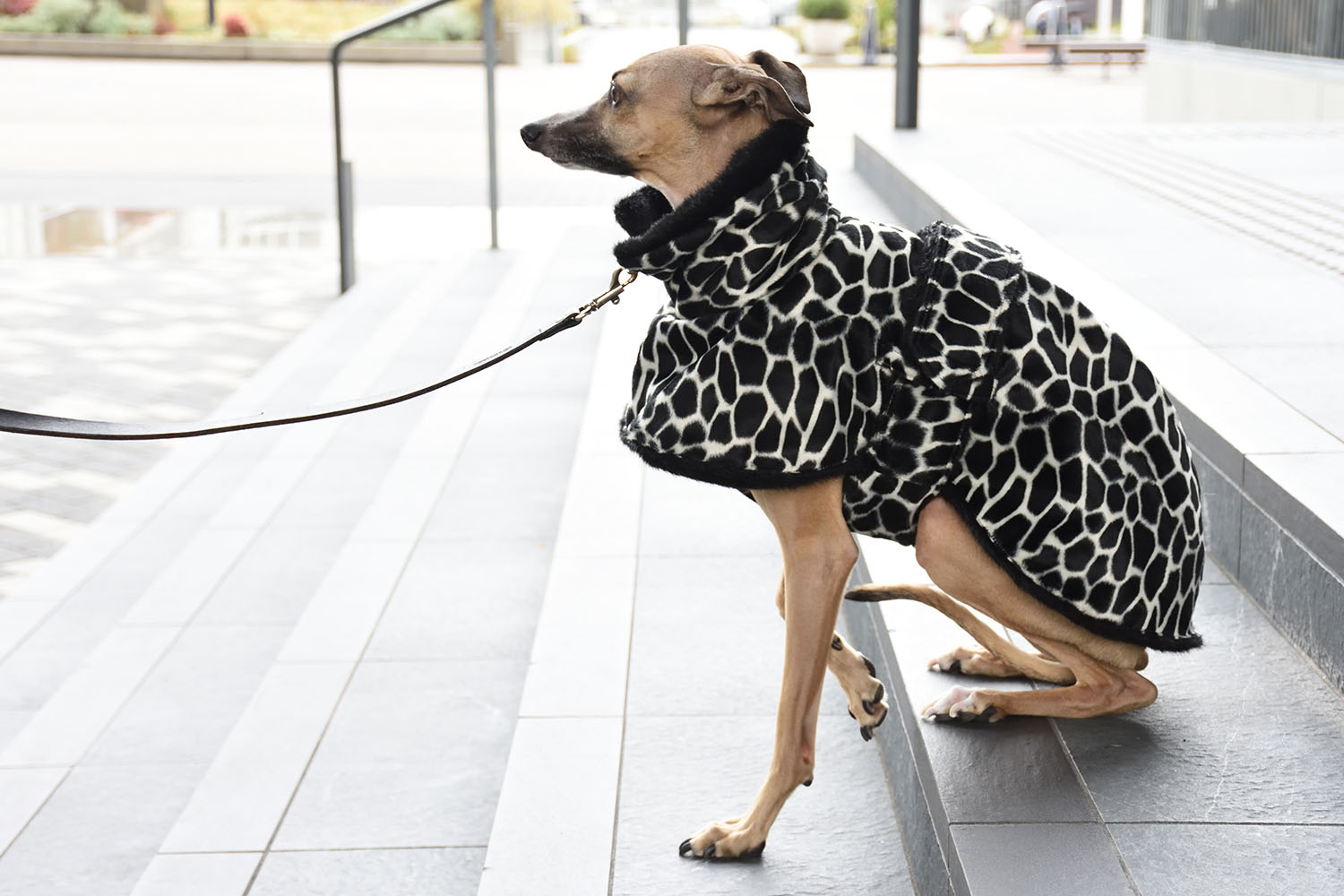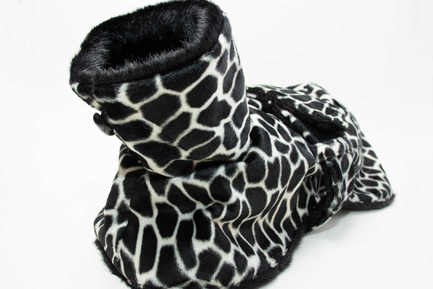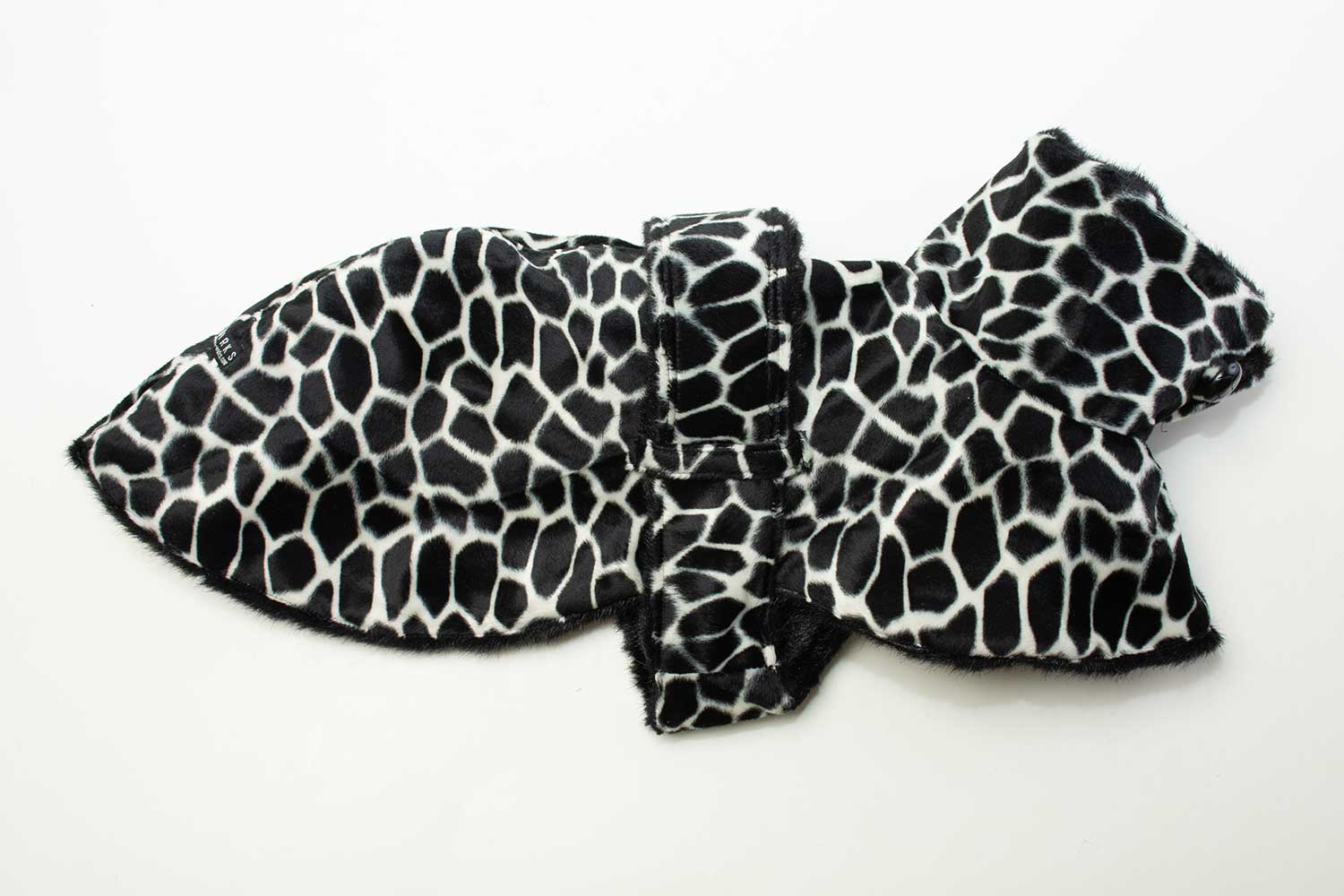外側にアニマル柄(キリン)の短めファー、内側にブラックの中長ファーを採用したモノトーンでクールな雰囲気のファーコートです。襟元はくるみ調のボタンで開閉でき、ベルトはマジックテープで調整可能です。ボディにベルト通しが付いているので、ベルトの後ろ下りを防止してくれます。ソフトで暖かいお洒落なIGコートです。