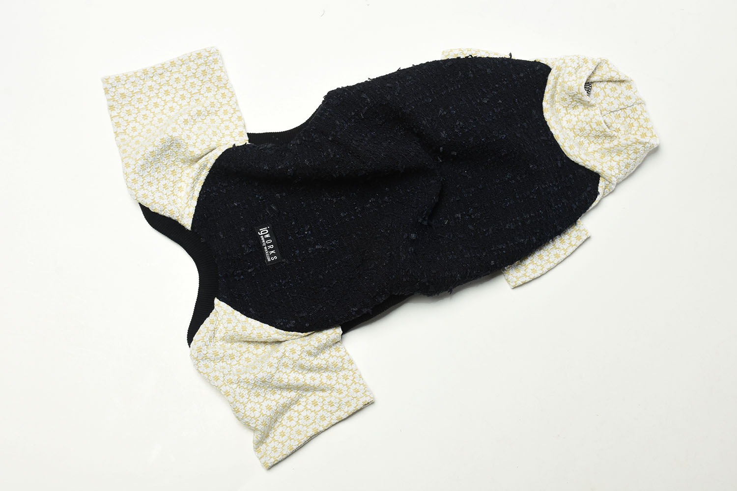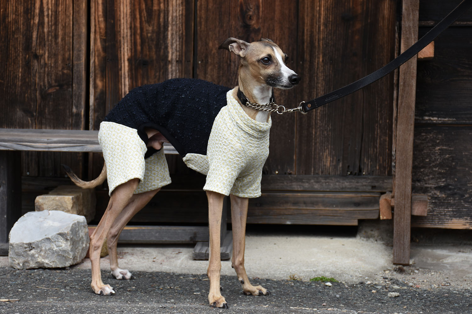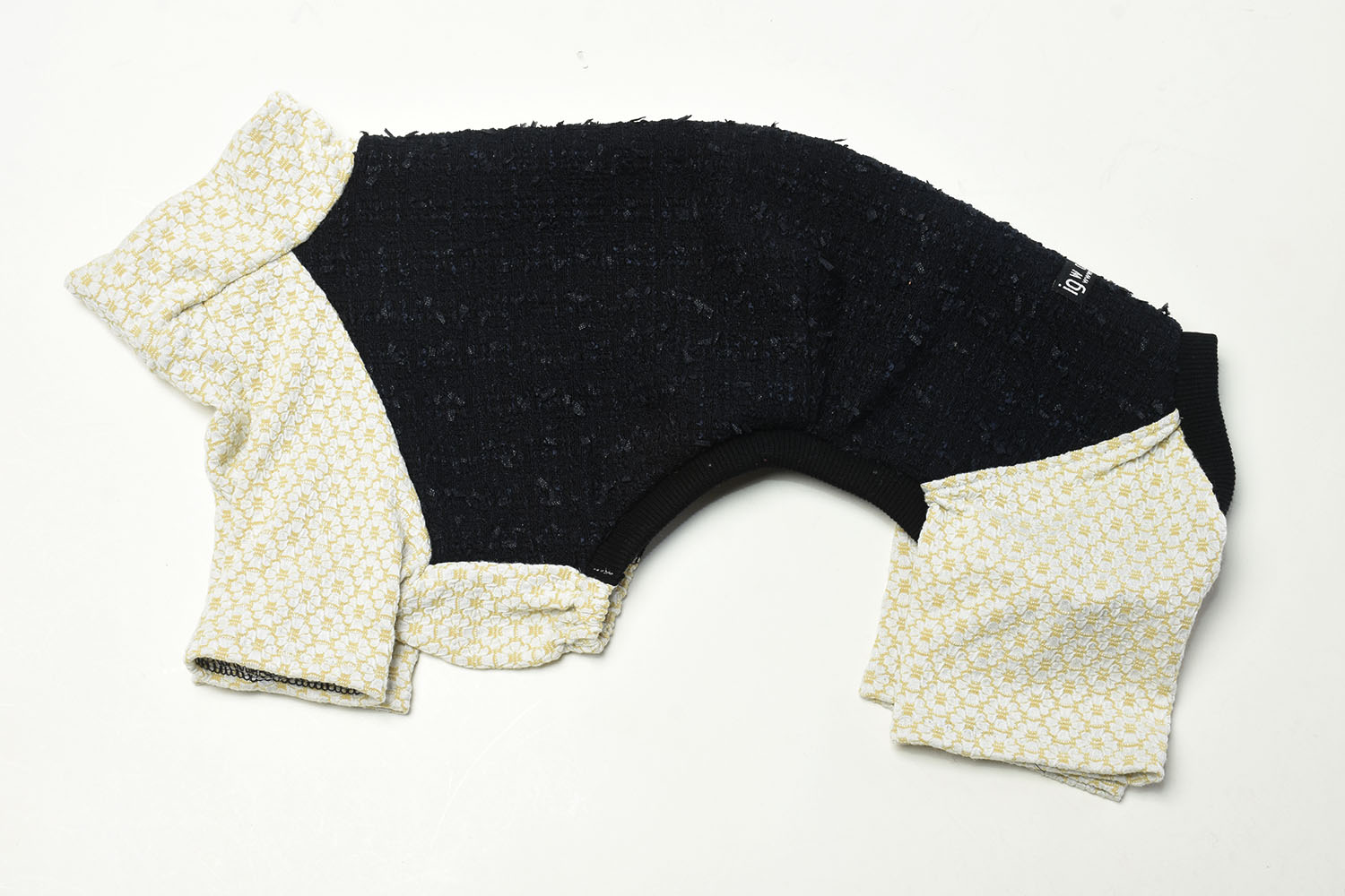背中には尾州産の高品質なファンシーツイード、脚・胸・首には可愛らしいフラワーシャーリングニットを採用した、イタグレ専用のオールインワン。上品さと愛らしさを兼ね備えたデザインに仕上げました。快適な着心地と動きやすさにもこだわり、イタグレの魅力をより一層引き立てます。