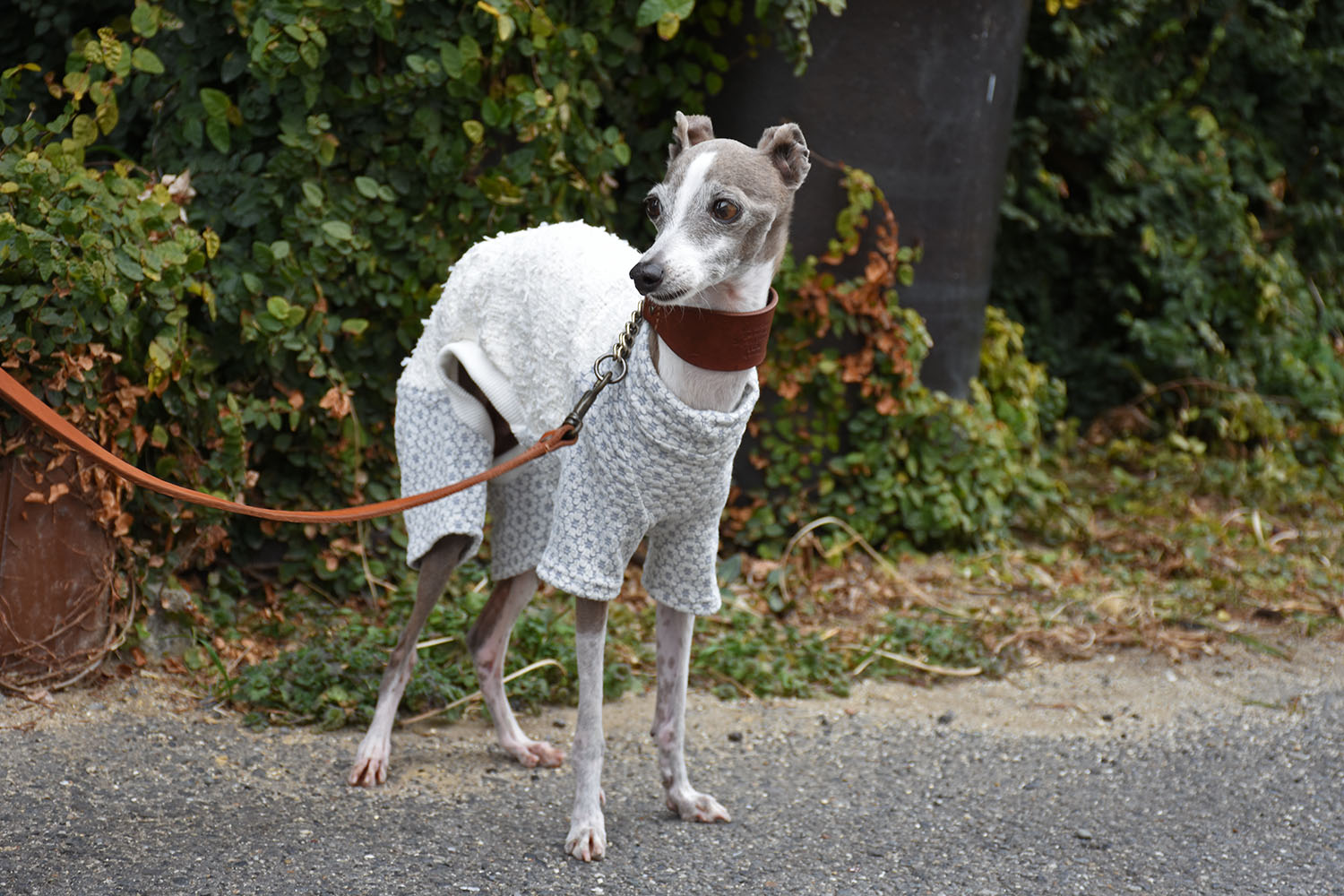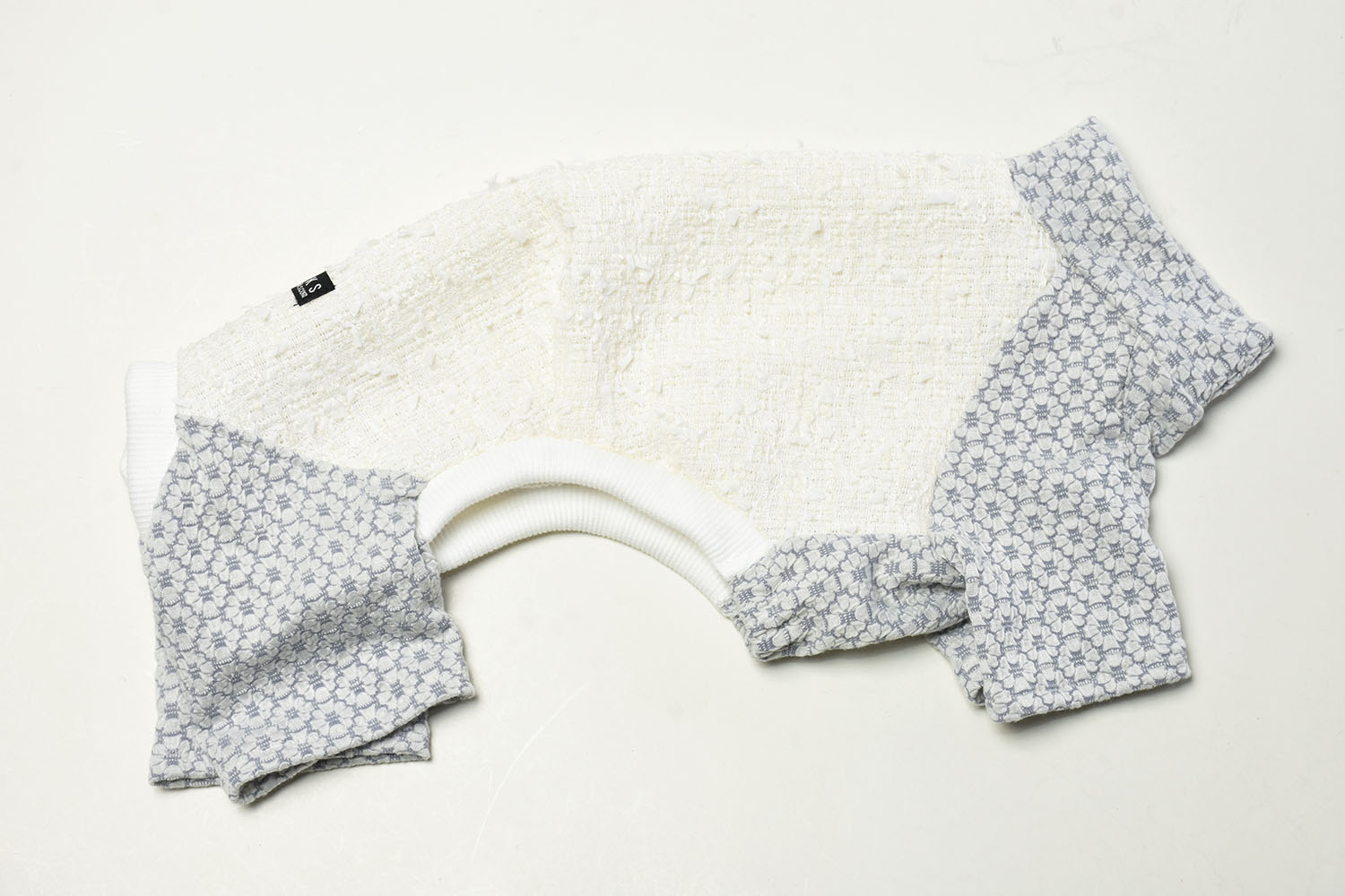 背中には尾州産の高品質なファンシーツイード、脚・胸・首には可愛らしいフラワーシャーリングニットを採用した、イタグレ専用のオールインワン。上品さと愛らしさを兼ね備えたデザインに仕上げました。快適な着心地と動きやすさにもこだわり、イタグレの魅力をより一層引き立てます。