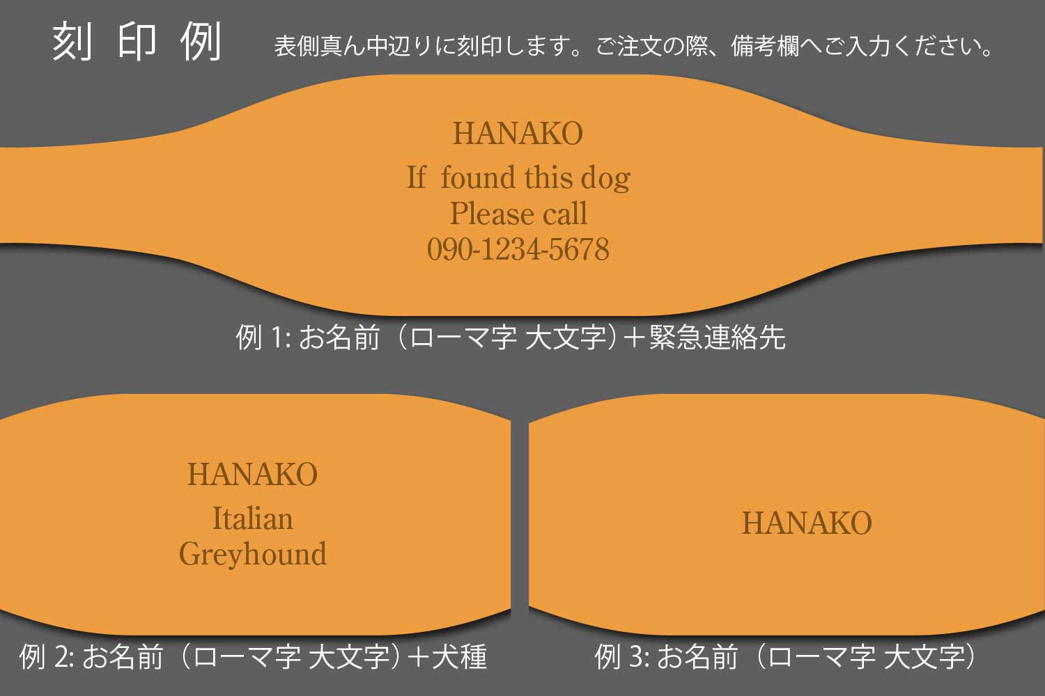 ●愛犬の名前の刻印(ローマ字 大文字)+緊急連絡先電話番号の刻印(If found this dog Please call 000-000-0000)