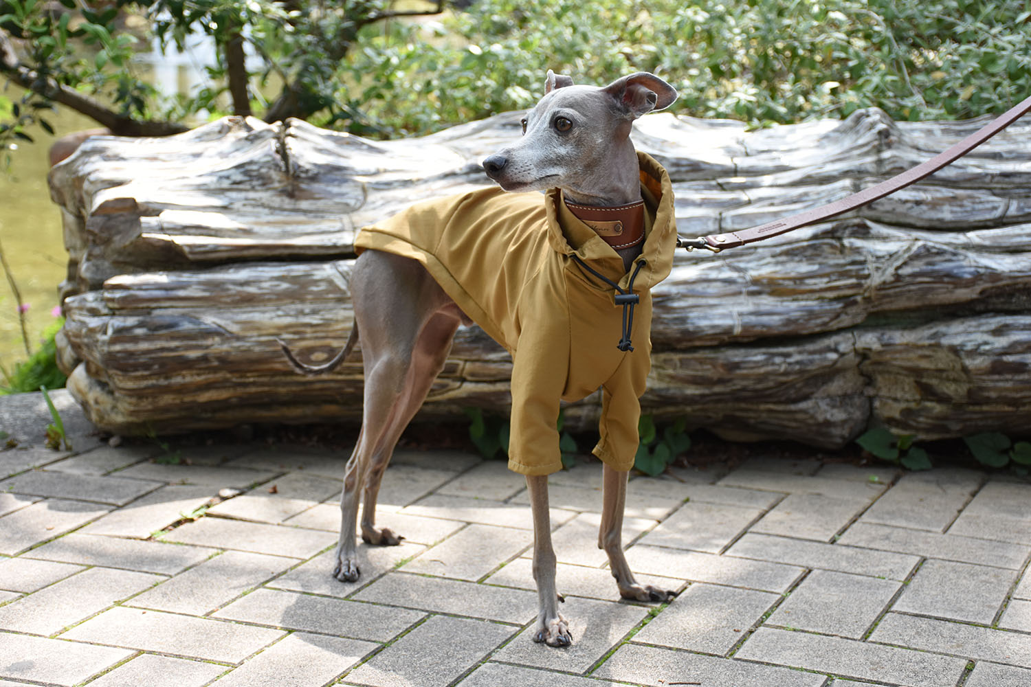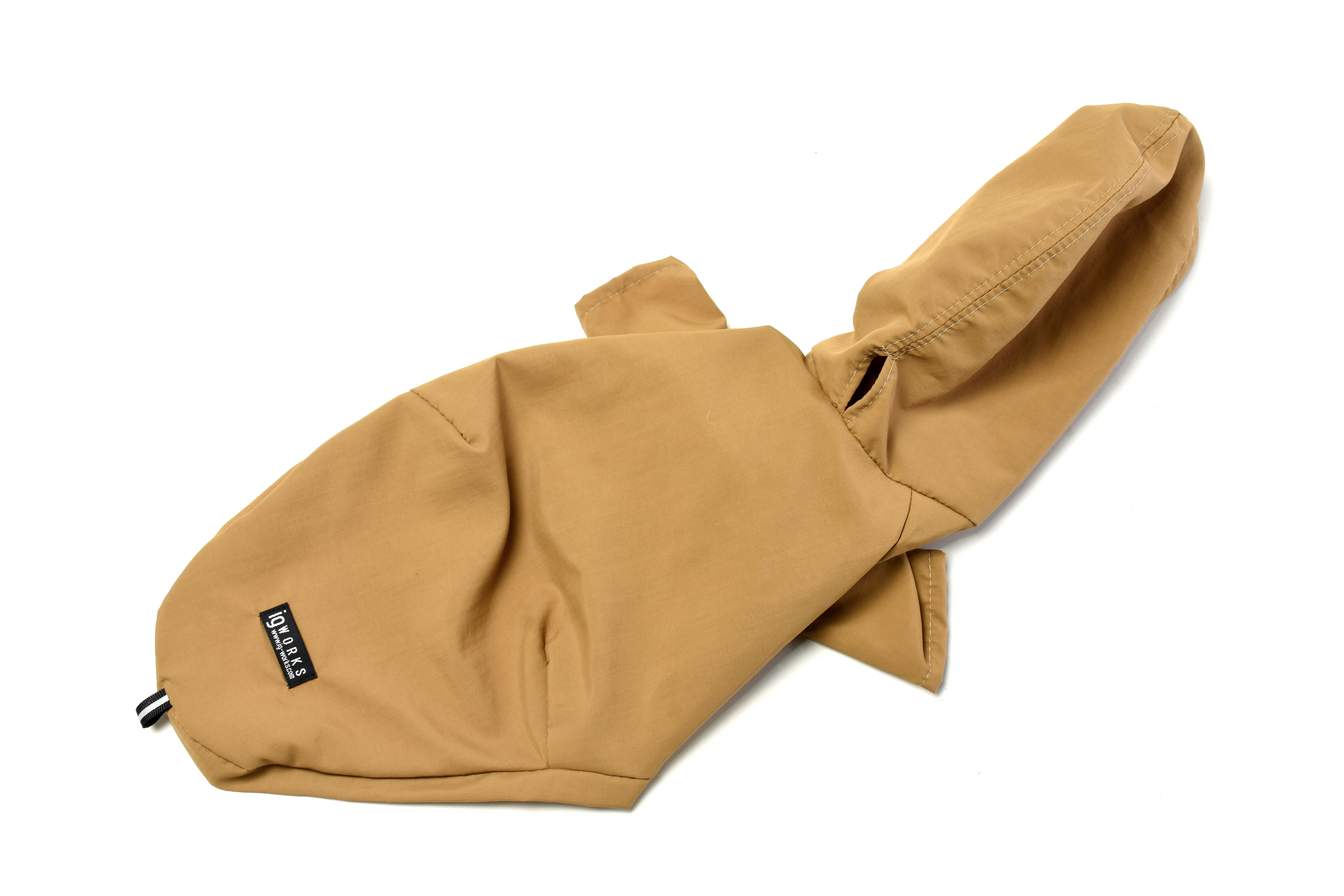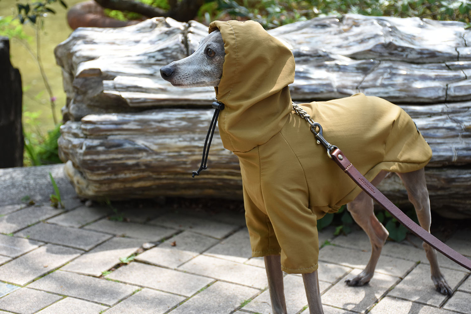 撥水加工を施したこの新アイテムのレイニーパーカー。雨の日だけでなく、風の強い日にはウィンドブレーカーとしても活躍!パーカーの後部には便利なリードホールが付いています。また、後ろ裾には蛍光テープがついているので、夜のお散歩も安心。生地の伸縮性が無いため、通常のお洋服よりも少しオーバーサイズのデザインとなっています。カジュアルでおしゃれなイタグレスタイルにぴったりな一着です。