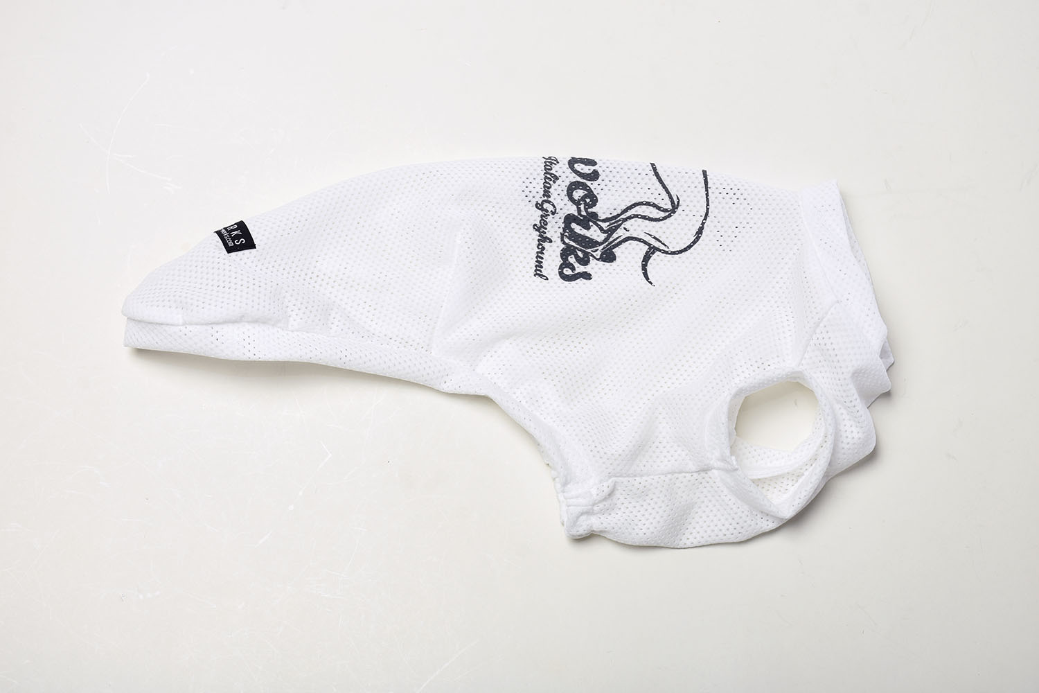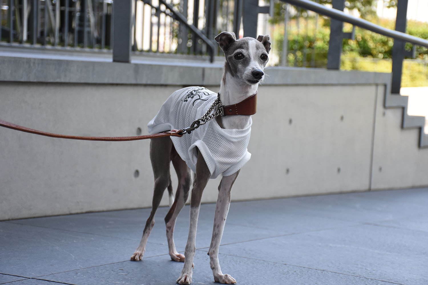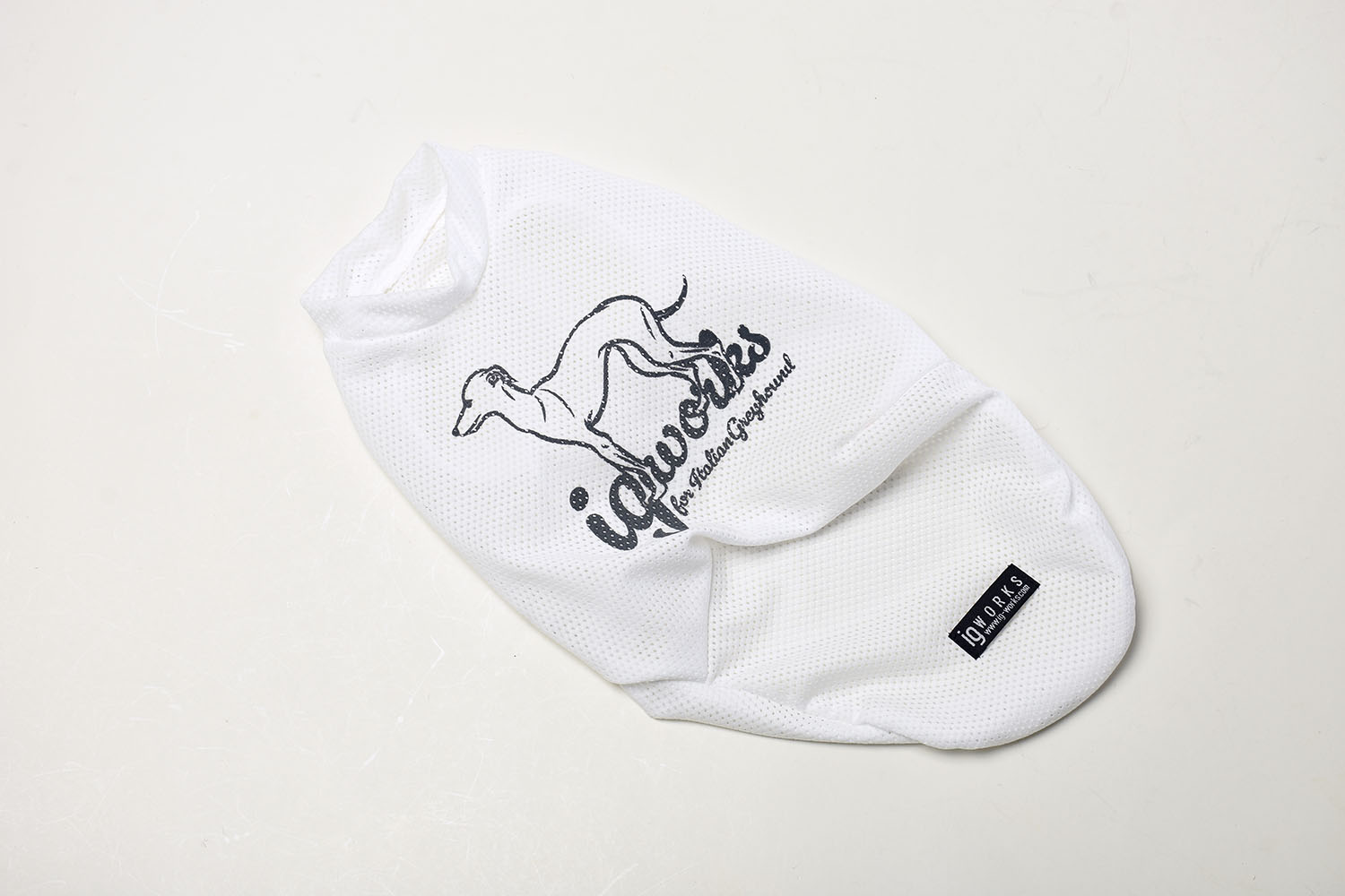 ソフトで軽やかなスポーツメッシュ素材に、ポップなイタグレのイラストをプリント。通気性が高く、激しい動きでもストレスフリーな着心地です。夏の強い日差しからも愛犬を守る、機能性とデザイン性を兼ね備えた一着。