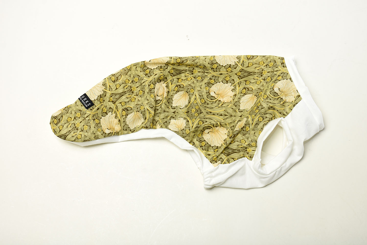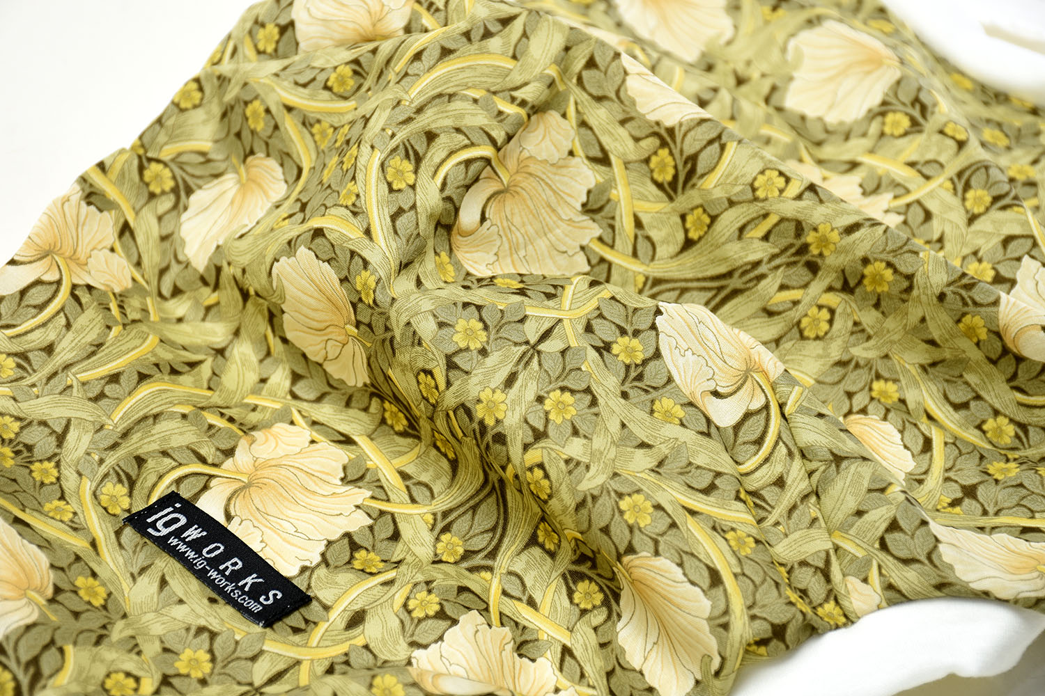 伝統的な英国テキスタイル、V&A William Morrisのローン生地を贅沢に使用した一着。繊細な平織りで軽く、サラリとした風合いが魅力です。首周りと胸元には、肌にやさしく伸縮性の高いシルケット天竺ニットを合わせ、着心地とフィット感を両立。暑い季節にも快適で上品な英国スタイル漂うおすすめアイテムです。